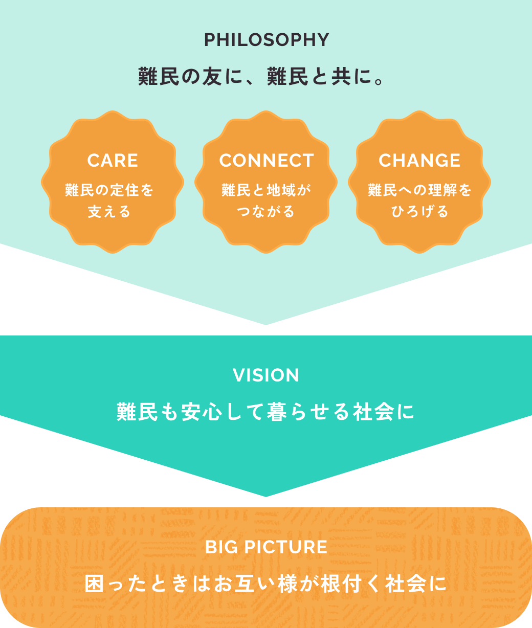 私たちは、「難民の友に、難民と共に。」という姿勢を根本に置きながら、難民の定住を支える・難民と地域がつながる・難民への理解をひろげる活動を通じて、この社会の境界線を少しずつ溶かしていきます。