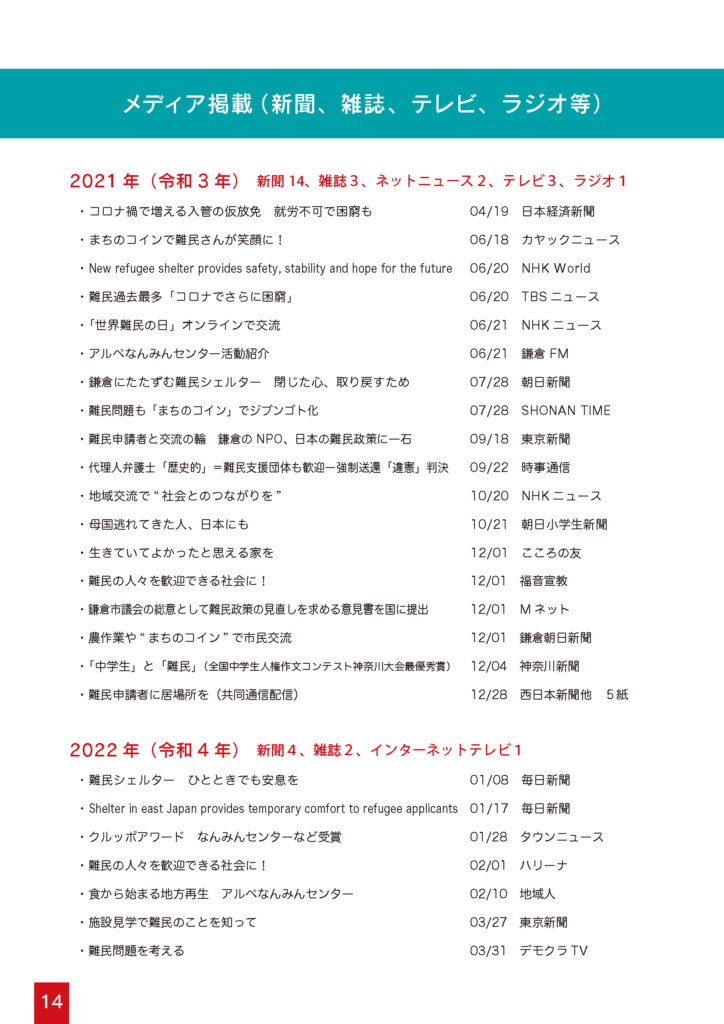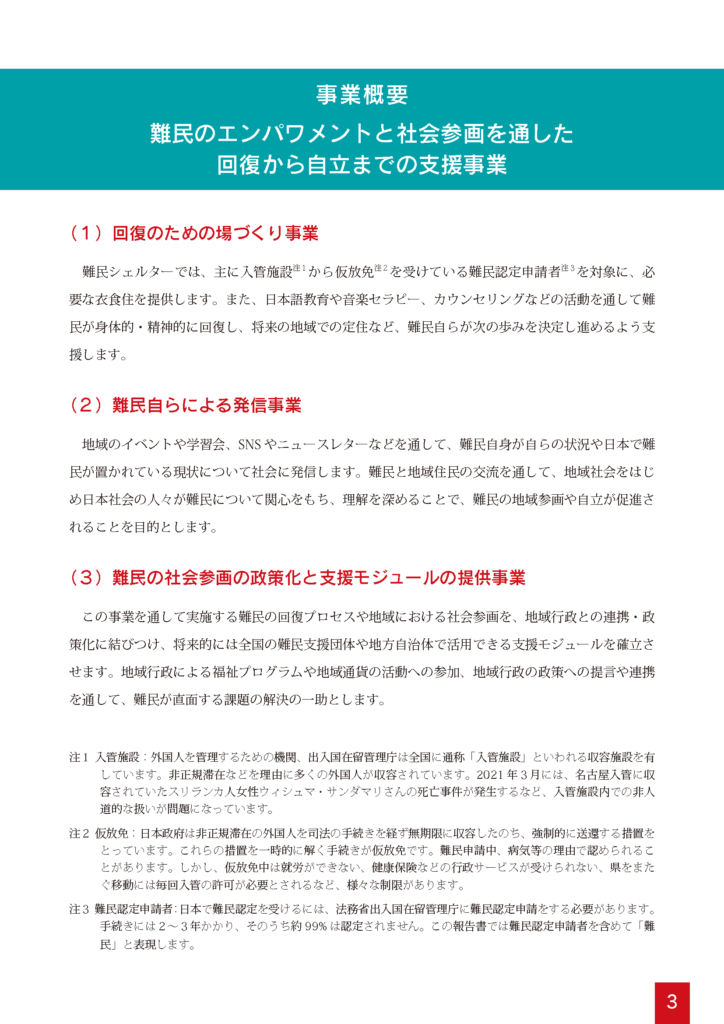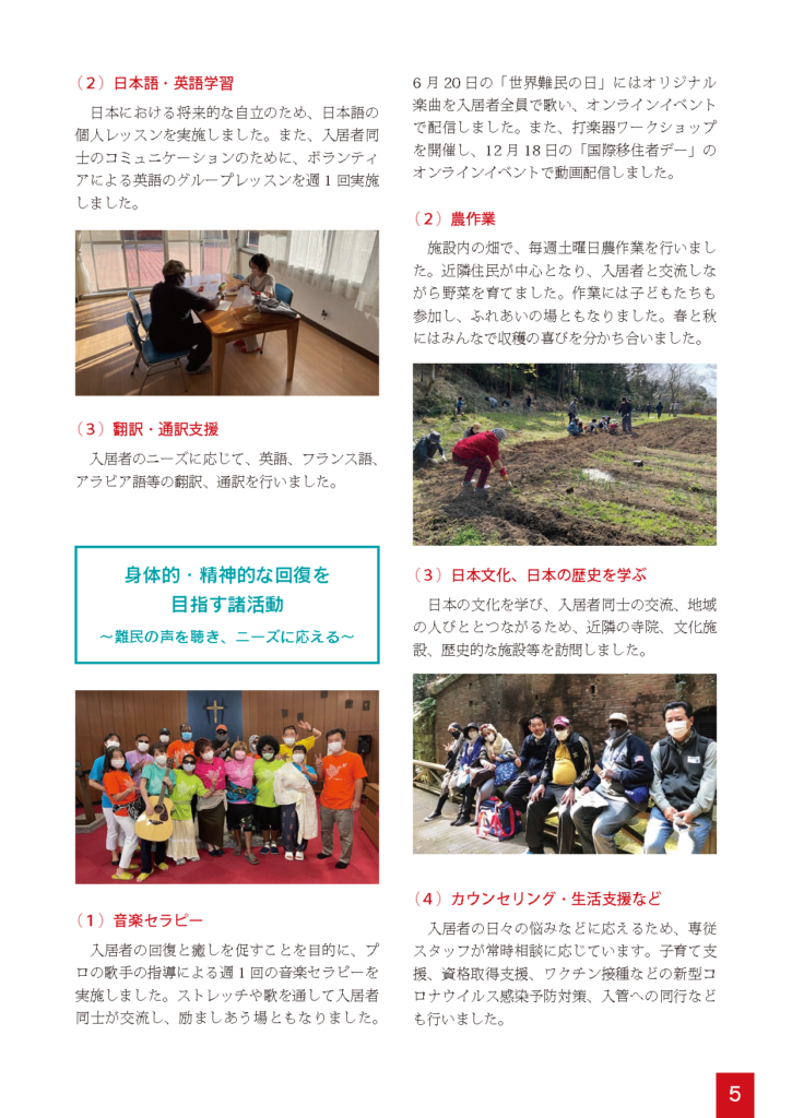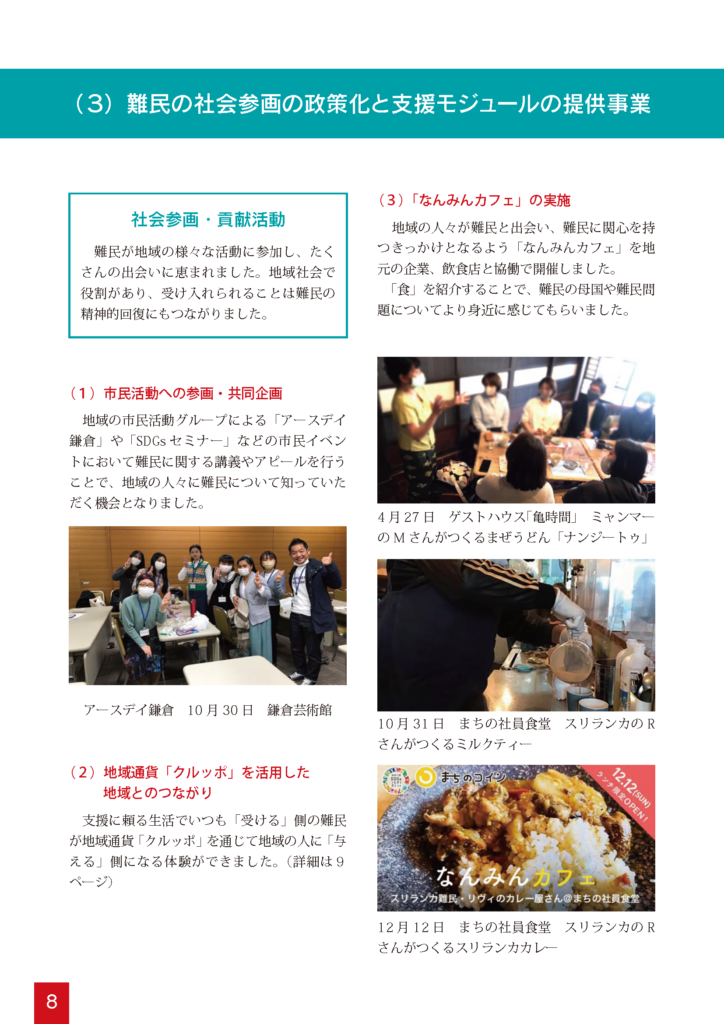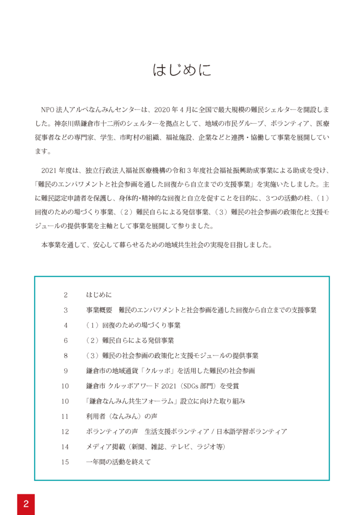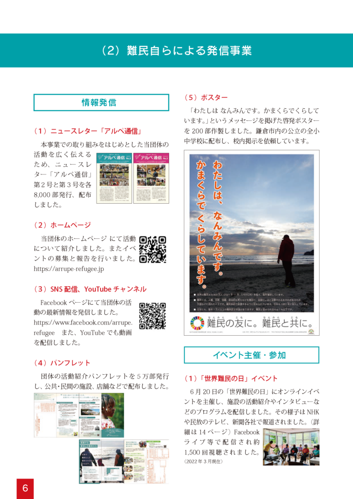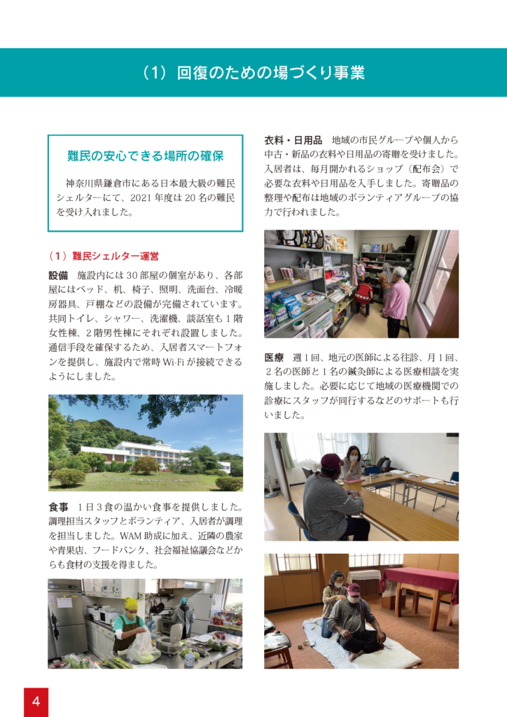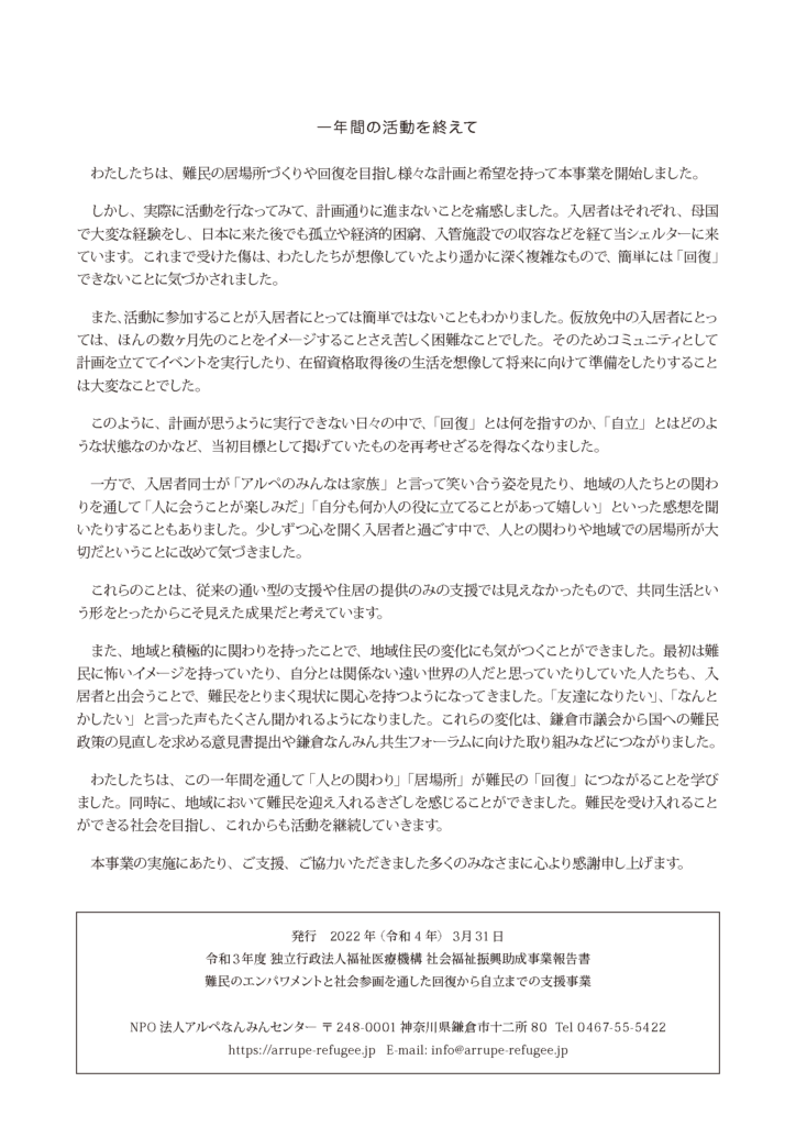 We have received support from the Welfare and Medical Service Agency’s WAM Social Welfare Promotion Grant Program for the 2021 fiscal year. We have prepared and published a report on the “Project to Support Refugees from Recovery to Independence through Empowerment and Social Participation.”
