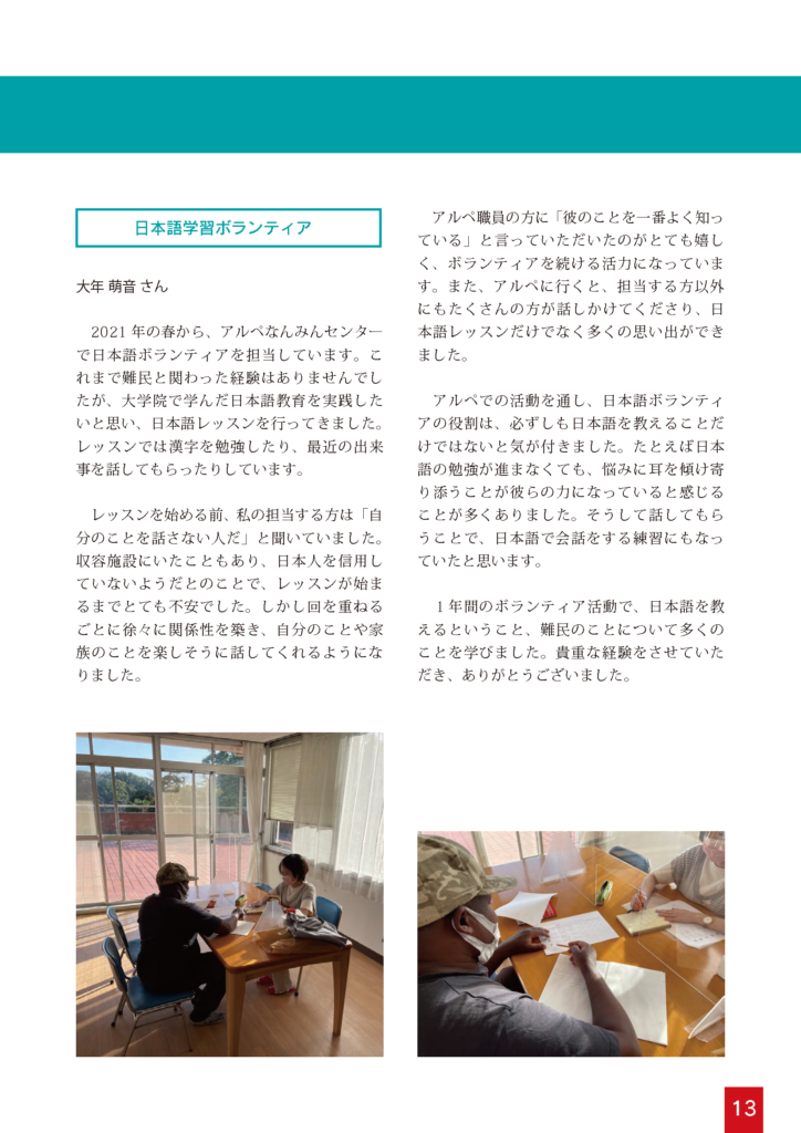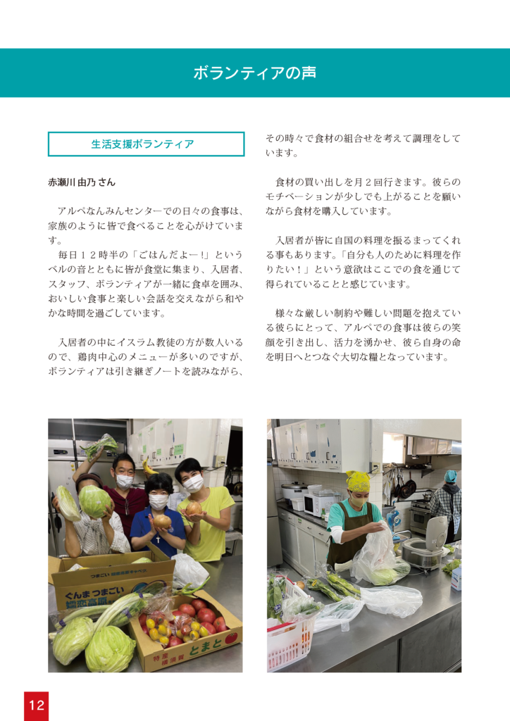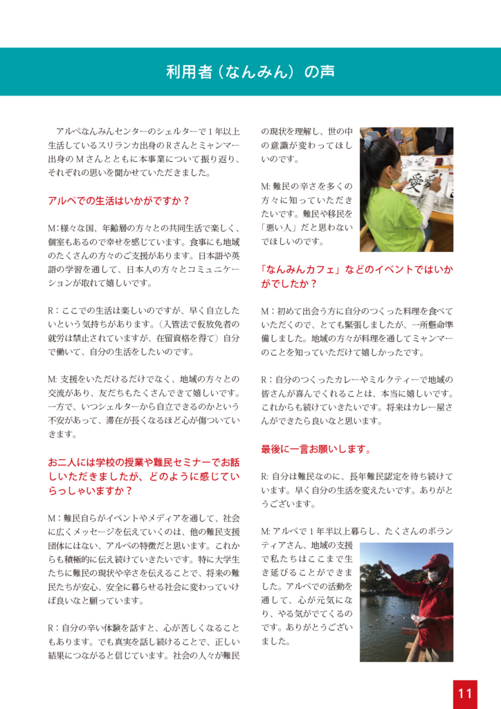We have learned over the past year that “relationships with people” and “a place to stay” lead to “recovery” for refugees. At the same time, we have also seen signs of acceptance in welcoming refugees into our communities. We will continue our activities to create a society that accepts refugees.