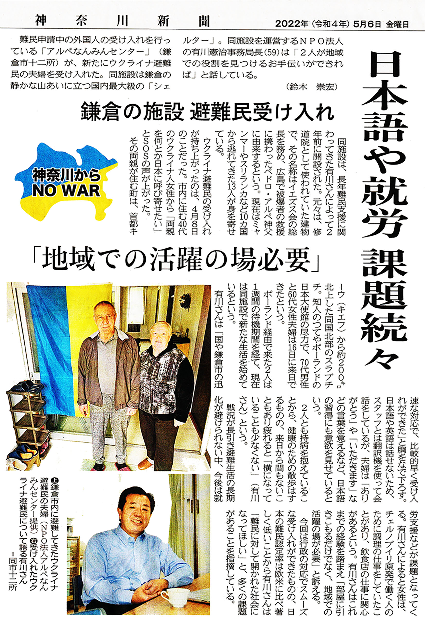 アレクセイさん、ナタリアさんは在留資格を取得し、鎌倉市民としての生活が始まっています。アルペでの暮らしにもすっかり慣れ、日本語学習も始まりました。ナタリアさんはウクライナで料理人として磨きあげた腕をふるい、ボルシチやピロシキ、ブリンチキ(クレープ)などを振る舞ってくださることもあり、身振り手振りも交えたコミュニケーションや翻訳アプリも活用しながらの共同生活を送っています。